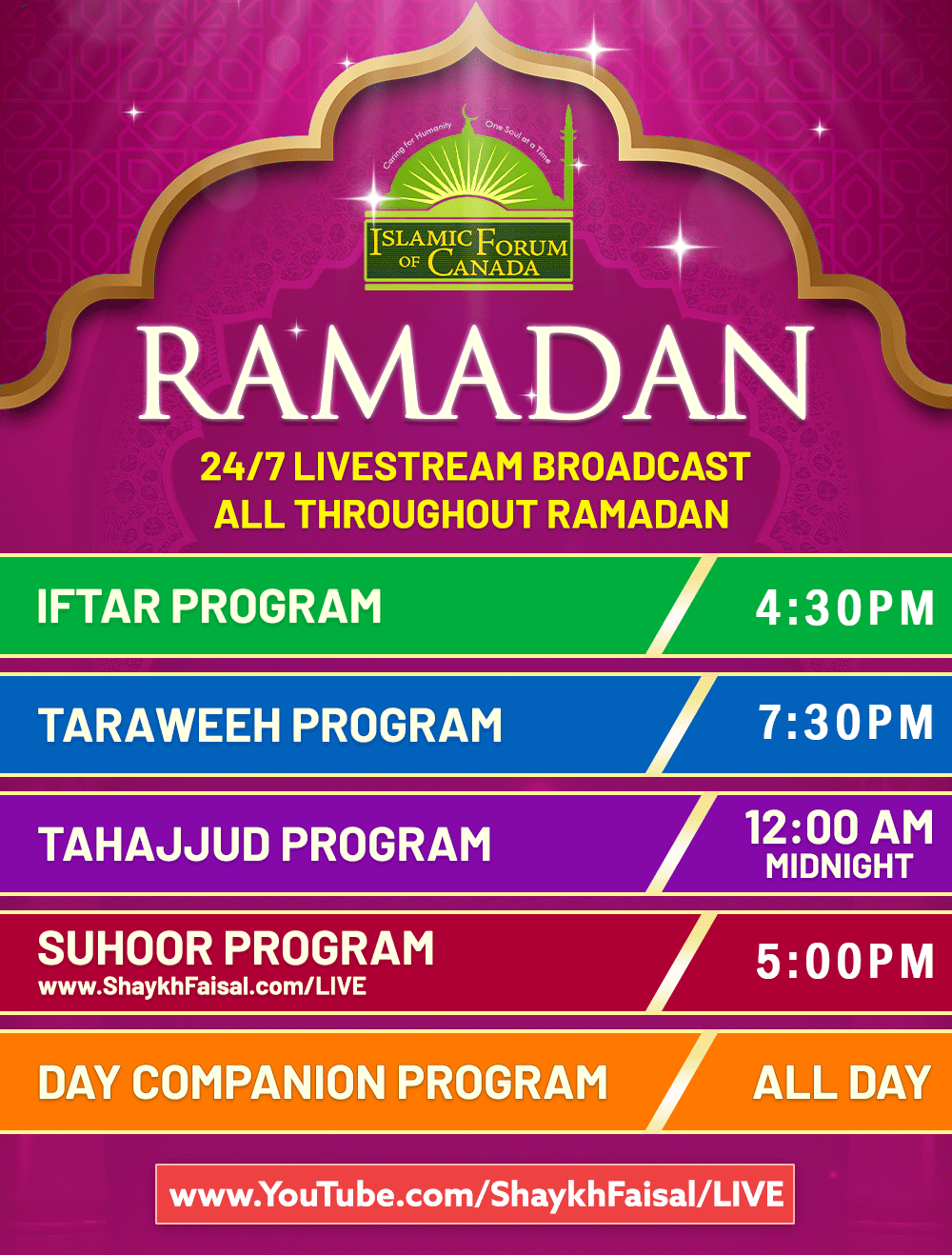 On this immeasurably happy occasion, the Islamic Forum of Canada wishes you and your family RAMADAN MUBARAK. Please come to the Islamic Forum and join us for the wonderful Ramadan Programs. All our Ramadan Programs are Broadcast on our YouTube Channel. The Link is: https://www.YouTube.com/ShaykhFaisal/LIVE
